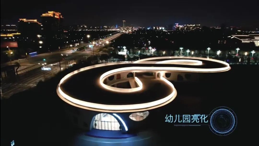 針對外國語學(xué)校,主要對其幼兒園和實驗樓建筑進(jìn)行亮化提升改造,將原有老化的傳統(tǒng)燈具進(jìn)行拆除,更新LED節(jié)能產(chǎn)品,采用3000K靜態(tài)光,豐富幼兒園建筑藝術(shù)形態(tài)的表現(xiàn);針對涌鑫公寓組團(tuán),重點表現(xiàn)在建筑頂部照明,選用線性燈與建筑結(jié)構(gòu)相結(jié)合,RGBW彩色光動態(tài),同時兼顧新都路和東環(huán)高架沿線的可視效果,強(qiáng)化區(qū)域標(biāo)識性。