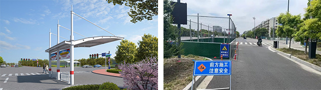 新建遮陽(yáng)擋雨棚項(xiàng)目效果圖(左)與現(xiàn)場(chǎng)圖(右)
