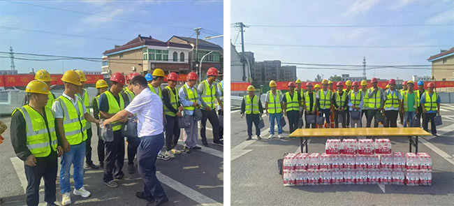 項(xiàng)目現(xiàn)場,張志軍詳細(xì)了解了項(xiàng)目作息時間、現(xiàn)場防暑降溫物資配備、高溫作業(yè)防護(hù)和安全生產(chǎn)措施等情況,并為每位施工人員分發(fā)了豐富的“清涼禮包”,包括礦泉水、藿香正氣水、人丹等一系列防暑降溫物品,承載著對工人健康與安全的深切關(guān)懷。他強(qiáng)調(diào),當(dāng)下正值高溫酷暑時期,各項(xiàng)目部要統(tǒng)籌做好各項(xiàng)安全生產(chǎn)工作,重點(diǎn)抓好高溫天氣的防暑降溫、安全防護(hù)措施和應(yīng)急處置等工作,合理安排作業(yè)時間,切實(shí)維護(hù)施工人員的職業(yè)安全和健康。